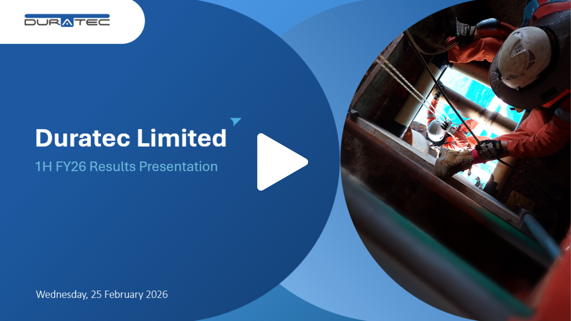 Watch our 1H FY26 Results Webinar Financial year FY 2026 / 27 FY 2025 / 26 FY 2024 / 25 FY 2023 / 24 FY 2022 / 23 FY 2021 / 22 FY 2020 / 21 FY 2019 / 20 FY 2018 / 19 1H FY26 Results Webinar 26/02/26 Dividend/Distribution - DUR 25/02/26 1H FY26 Results announcement 25/02/26 1H FY26 Half Year Accounts 25/02/26 1H FY26 Results Presentation 25/02/26 Appendix 4D Half Year Accounts 25/02/26 Change of Director's Interest Notice - C Oates 19/02/26 Notification regarding unquoted securities - DUR 19/02/26 Notification regarding unquoted securities - DUR 19/02/26 Duratec 1H FY26 Results Webinar 30/01/26 Notification of cessation of securities - DUR 09/01/26 Instructed to proceed with early procurement @ HMAS Stirling 08/01/26 2025 AGM Webcast 24/11/25 Results of Meeting 20/11/25 2025 AGM Addresses and Presentation 20/11/25 Notice of Annual General Meeting/Proxy Form 21/10/25 Change of Director's Interest Notice - M Brydon 15/10/25 Application for quotation of securities - DUR 15/10/25 Securities Trading Policy 15/10/25 Update - Dividend/Distribution - DUR 02/10/25 Prev 1 2 3 4 5 6 7 8 9 … 13 Next Sorry, there were no documents found matching your search criteria.
