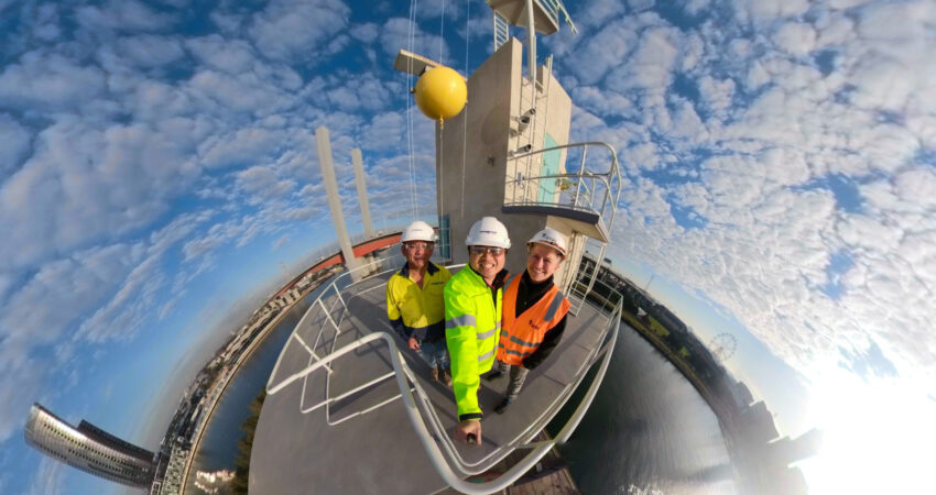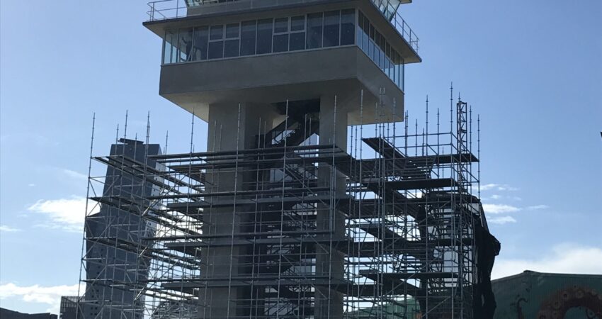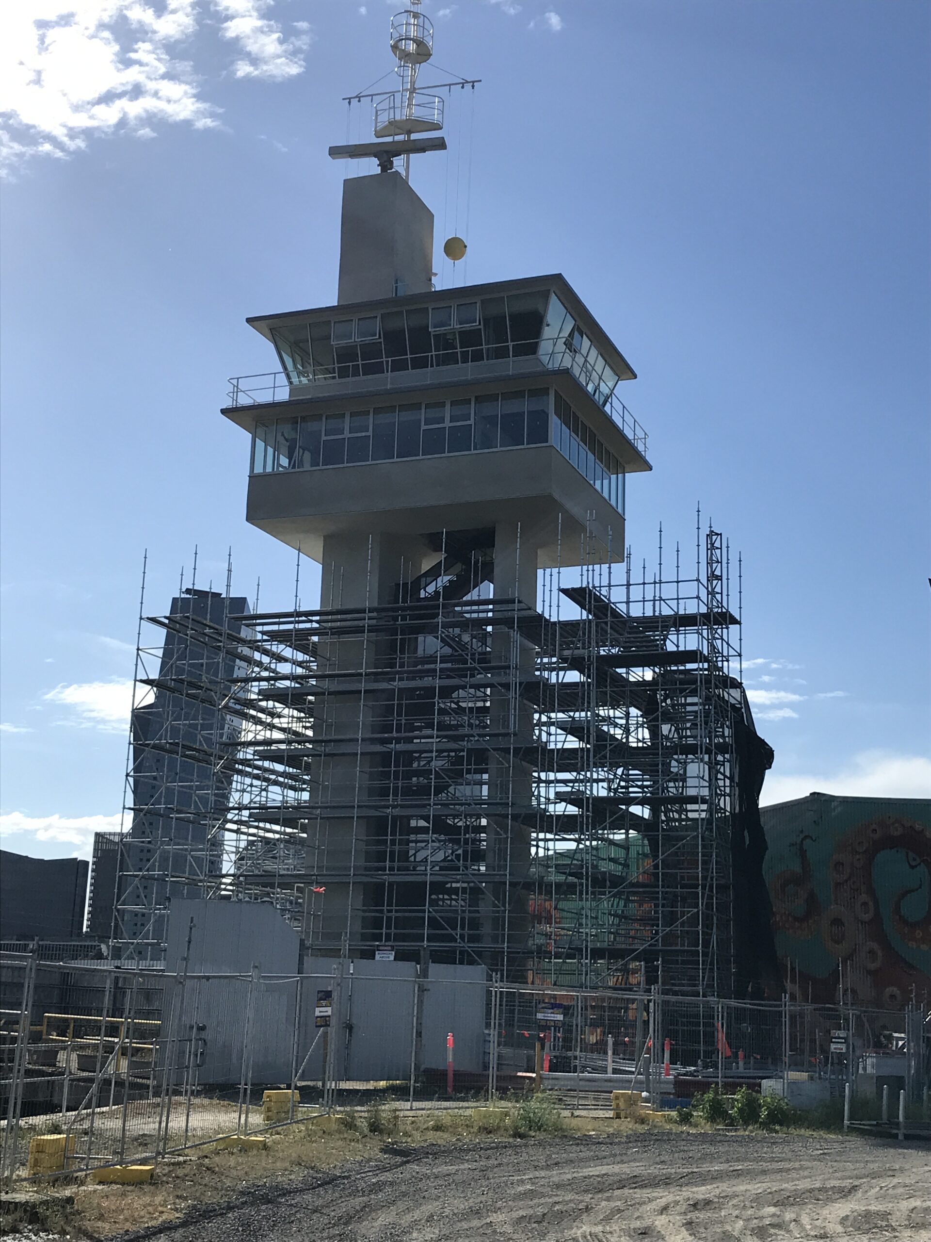 The tower’s location on the wharf exposed it to high winds and harsh weather. Specialist scaffolding was installed to withstand gusts of up to 67 km/h. Wide bays and shade cloth mesh was added to the scaffolding to protect workers and to help maintain structural integrity.